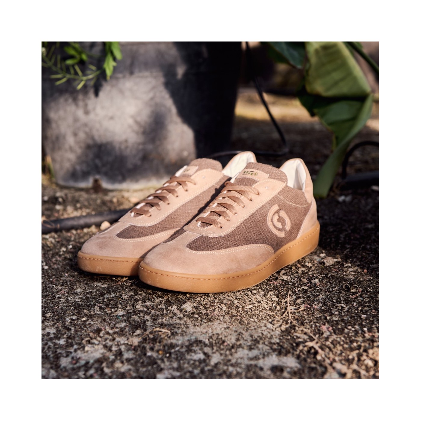 Premium-Materialien: Obermaterial aus atmungsaktivem, natürlichem Hanf mit Mikrofaser-Details. Innenfutter aus weichem Baumwollfrottee.